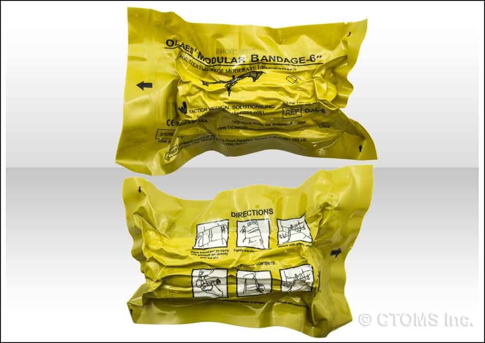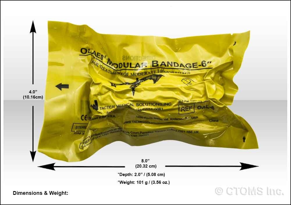 The Olaes® Modular Bandage is the newest generation of trauma bandages and is advantageous for all levels of care providers. Packed with features such as 3 meters of gauze, a removable occlusive plastic sheet behind the dressing pad, and a pressure bar that can also act as an eye cup, the advanced capabilities of the bandage are tucked neatly away and can be utilized if required or simply ignored. No hooks or clips to confuse or delay care. Velcro® "Control" strips prevent the elastic roll from accidentally unraveling and secure the bandage throughout the application process. Designed with direct input from some of the most experienced combat medics in the world, no detail has been left out. From the adhesive "brakes" on the elastic bandage that prevent accidental unrolling to the zig-zag packed gauze that easily feeds from the bandage, this is the most comprehensive feature packed bandage available without any added confusion.