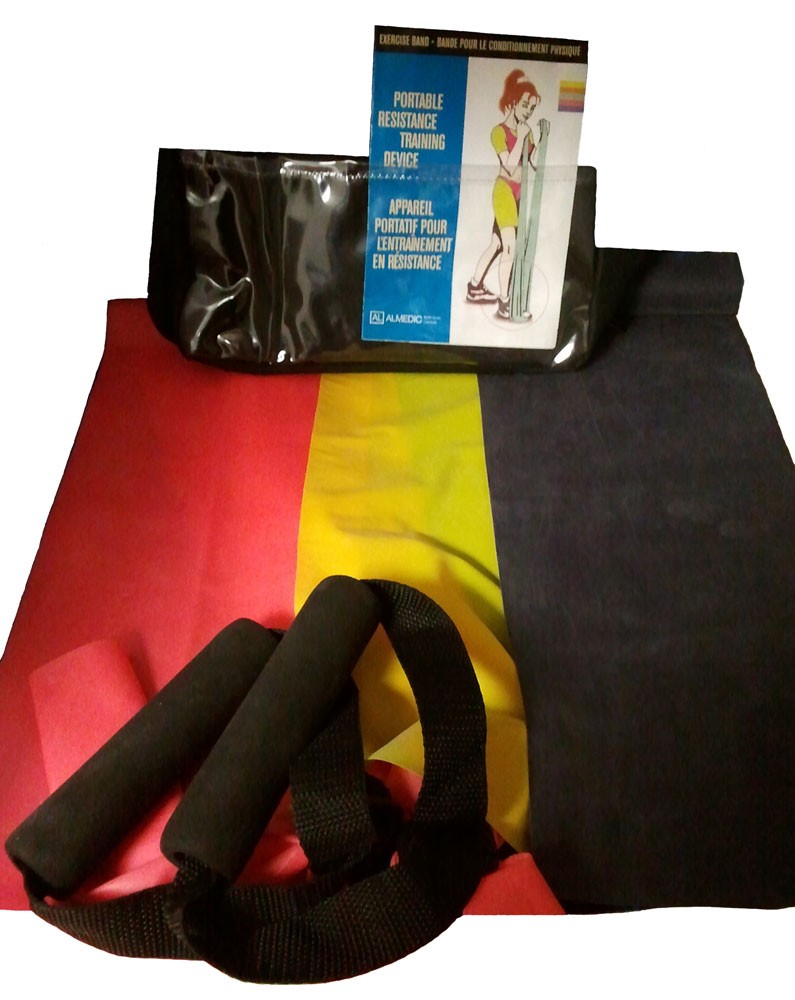 Kit comes complete with three (3) 2 metre long clour coded resistance bands, handles (2) and a carying case.