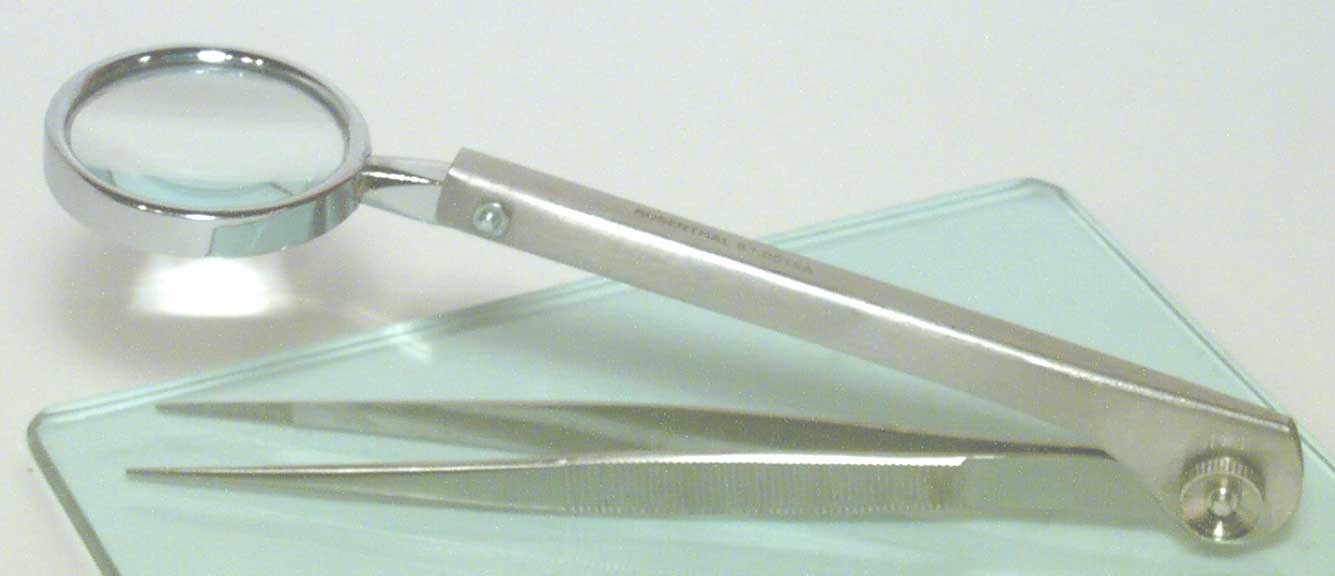 Splinter forceps with a 1" (3.5 cm) circular magnifier attached at the base and opens to a 180 degree angle.